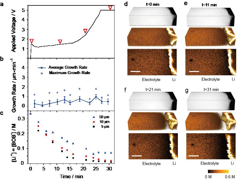 图3:2D 锂电极上离子传输/耗尽和枝晶生长的可视化