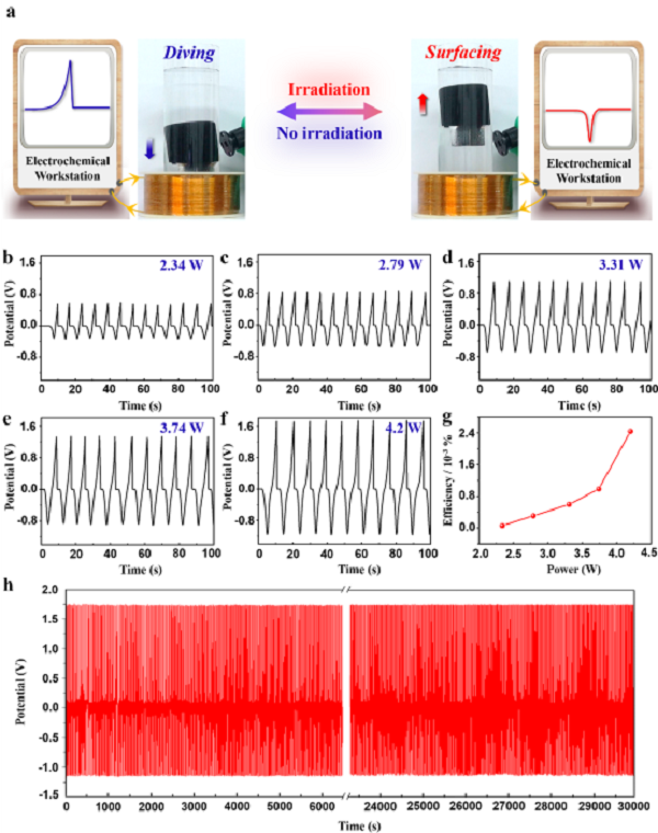 图3:输出电能的应用及太阳光下器件的上浮下潜运动