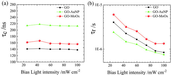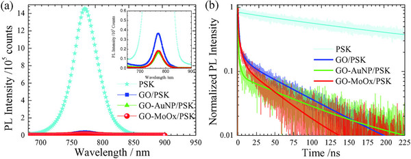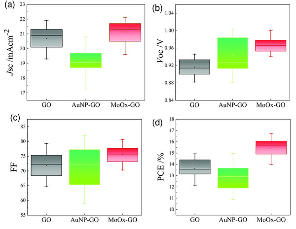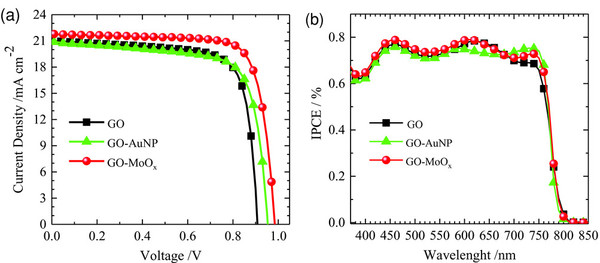 研究人员采用Au和MoOx纳米颗粒改性GO薄膜,用作反式钙钛矿太阳能电池的空穴传输层,器件的开路电压明显提高。其中MoOx功能化GO薄膜作为空穴传输层,因其p型掺杂效应,显著抑制钙钛矿层与GO层界面的电荷复合,从而提高器件的性能。该研究为发展碳基空穴传输层钙钛矿电池提供了新的思路与方法,推动了反式钙钛矿器件的进一步发展。