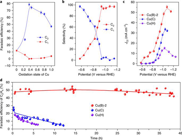 a,Cu(B)上不同铜氧化态下C2和C1的法拉第效率。