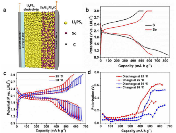 (d)在室温和60 ℃下,由GITT测得的Se / Li3PS4 / Li电池相应极化曲线