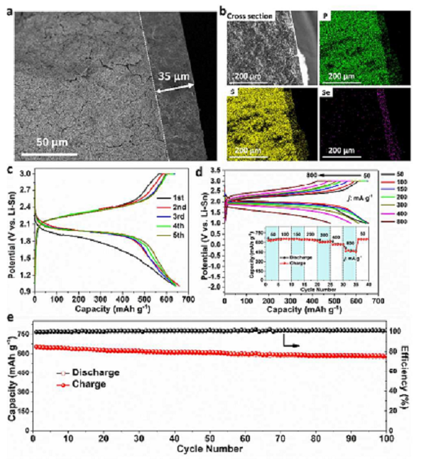 图三 Se / Li3PS4 / LiSn全固态电池的SEM和电化学表征