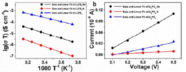 (a)球磨过程后,商用Li3PS4、SeLi3PS4及S-Li3PS4的温度依赖于离子电导率的变化曲线