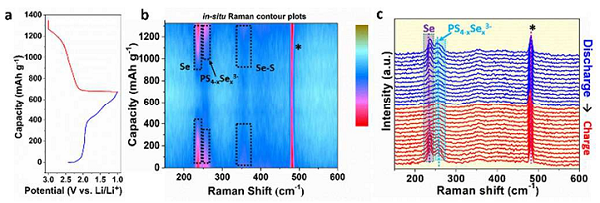 该研究首次证明了全固态Li-Se电池具有良好的电化学性能。在室温下,Se阴极展现出更高的利用率及较低的极化。研究发现:与S-Li3PS4电极材料相比,Se-Li3PS4电极材料具有更优异的离子电子导率;Se-Li3PS4-C阴极中可以实现更快的电荷转移;通过非原位XRD可以观察到放电状态下Se转化为Li2Se,以及全充电状态下Se的回收(即Se与Li2Se可相互转化);此外,原位拉曼分析揭示了(1)Se阴极在放电/充电过程中详细的演化过程;(2)可逆界面PS4-xSex3-体系在阴极复合材料中存在着独特的锂化/脱锂反应。这项研究工作表明全固态Li-Se电池可作为极具前景的高能储存系统,并为固态电池/电极界面化学提供新的见解。
