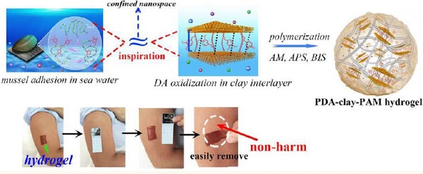 受限于聚合物网络结构以及含水量丰富的性质,水凝胶的力学性能较差,而生物支架或者软骨组织替代物对材料的韧性与机械强度都有一定的要求,因此适当提高水凝胶材料的力学性能能够促进其在生物医学领域的发展。鲁雄等人受到贻贝粘附现象的启发,发展了一种聚多巴胺-粘土-聚丙烯酰胺的水凝胶基胶带。在这种材料中,多巴胺插入粘土纳米片层中并在其中进行有限的氧化作用从而为纳米片层引入了丰富的自由邻苯二酚分子,可有效增强材料的粘性。随后丙烯酰胺单体也被引入并原位生成水凝胶。由于纳米粘土可的存在,水凝胶的韧性被大大增强,其粘性持续时间明显提高,可反复使用,更有利于药物分子的缓释作用。
