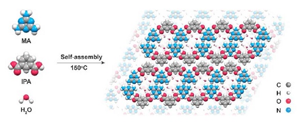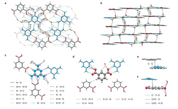 近日,南京工业大学黄维院士和安众福教授(共同通讯)通过三聚氰胺和芳香羧基在水溶液中的自组装制备了超长有机磷光材料。通过多种分子间相互作用形成的超分子框架,可以构建刚性很强的三维网络将原子固定在其中,在有效减少三线态电子非辐射跃迁的同时,促进系间窜越。所获得超分子有机框架可实现长达1.91秒的发光寿命和24.3%的磷光量子效率。该成果以题为”Simultaneously Enhancing Efficiency and Lifetime of Ultralong Organic Phosphorescence Materials by Molecular Self-assembly“发表在J. Am. Chem. Soc.上。