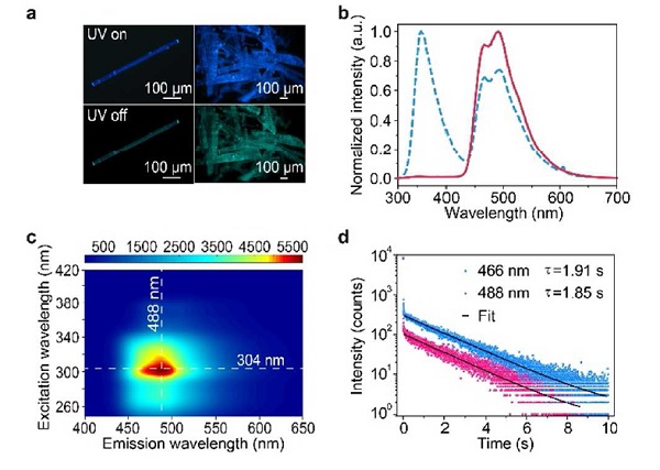 (a).单晶在紫外光照时和光照后的荧光显微镜照片