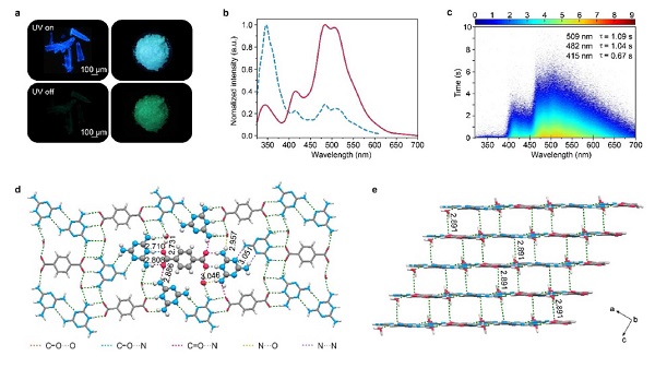 在这个工作中,作者通过三聚氰胺和芳香羧基在水溶液中的自组装,构建了一种具有高效超长磷光的超分子框架。通过多种分子间相互作用形成的超分子框架,可以构建刚性很强的三维网络将分子固定在其中,在有效减少三线态激子非辐射跃迁的同时,促进系间窜越。所获得超分子有机框架可实现长达1.91秒的发光寿命和24.3%的磷光量子效率。这个材料并成功应用于黑暗环境中的二维码识别中。这个工作不仅提供了一种构建高效超长磷光材料的方法,同时也扩展了这种材料的应用。