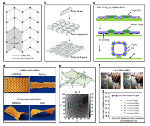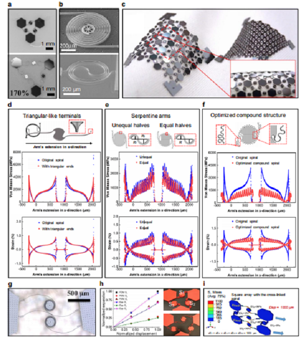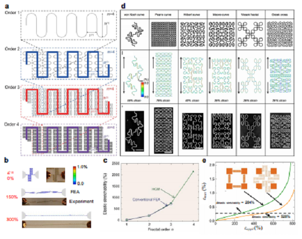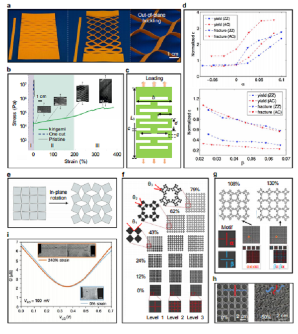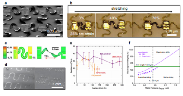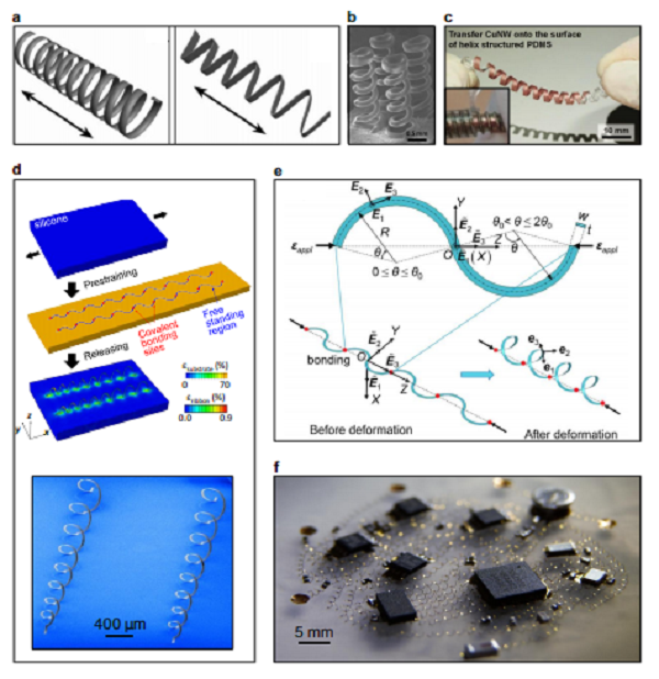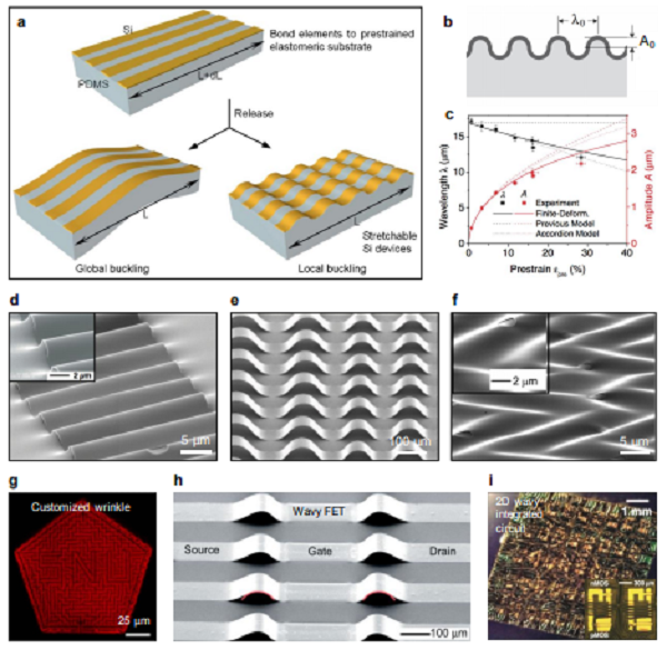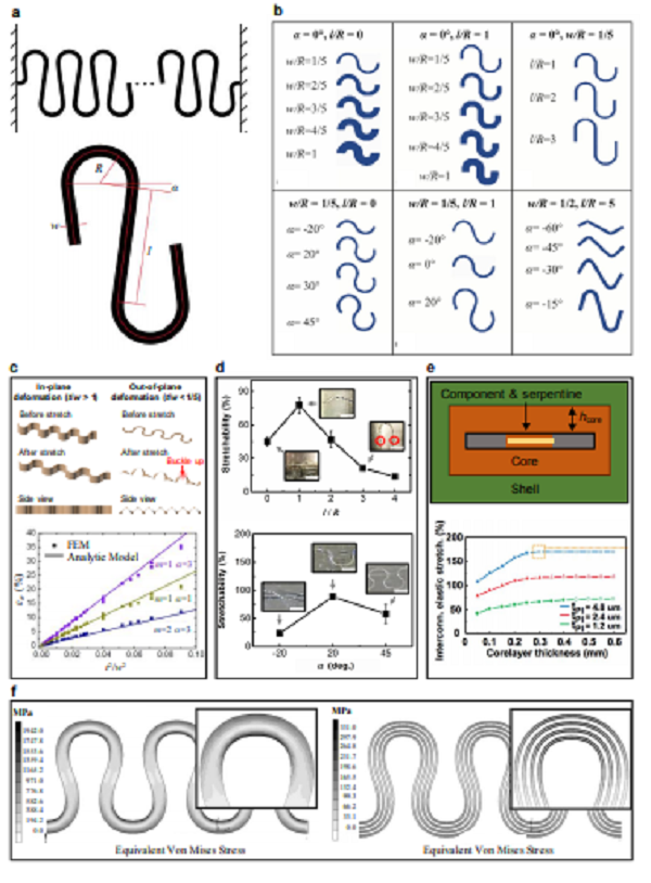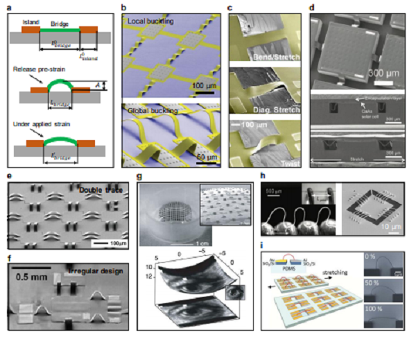 根据曲面能否展成平面分类,曲面分为可延展曲面和不可延展曲面。可延展曲面具有零高斯曲率,在非拉伸或非压缩情况下能够展开成平面,例子包括圆柱和圆锥表面。不可延展曲面则不满足此标准,例子包括球面和人的身体表面。根据定义,柔性电子器件仅能覆盖可延展曲面,而可拉伸性则变得需要当器件想要无缝集成于不可延展曲面。两种策略能够赋予器件可拉伸性能:1) 材料创新,通过合成本征可拉伸的或者集成可拉伸的材料;2) 结构设计,赋予不可拉伸材料特殊的机械结构,通过材料结构形变吸收施加在器件上的应力应变,从而避免材料本身失效。