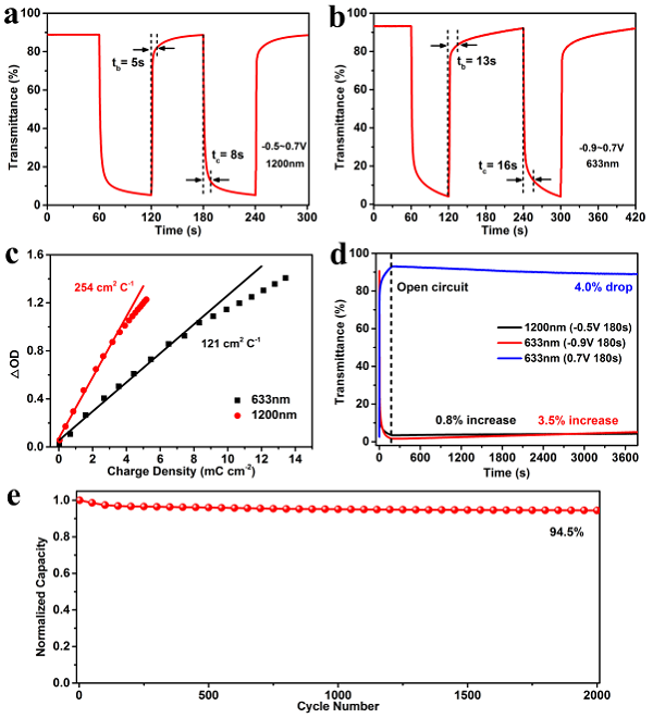 图3. 响应时间,着色效率,记忆效应和循环稳定性表征