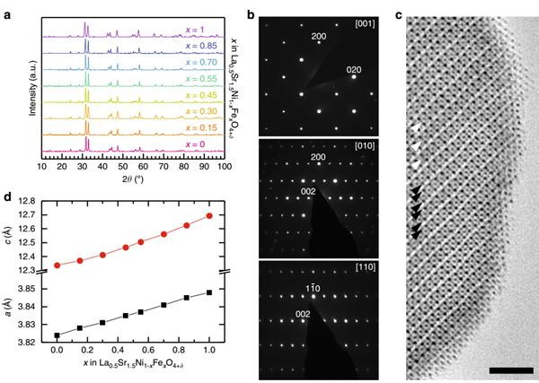 图1. La0.5Sr1.5Ni1-xFexO4±δ材料的晶体学表征。