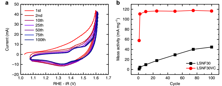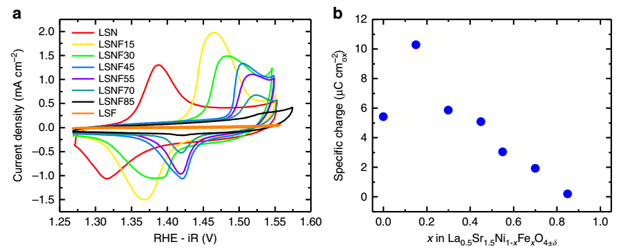 a. LSNF的CV为100 mV s-1,显示出Ni取代时Ni2+/3+氧化/插层电位的系统阳极位移;b. 对氧化波积分产生的特定氧化电荷(μC cm-2氧化物)。使用特定电流密度(μA cm-2氧化物)进行积分以归一化催化剂表面积的差异。