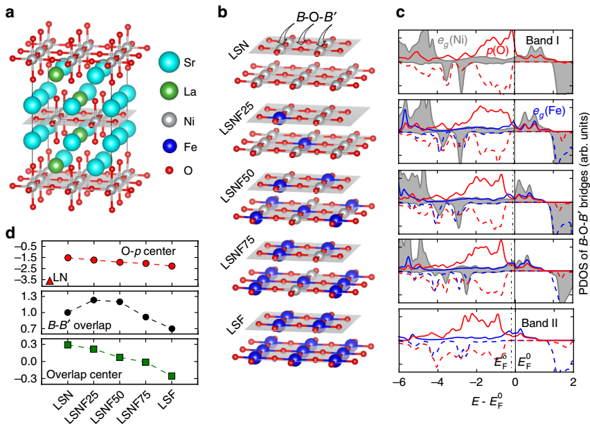 c. 相对于B-O-B’桥的费米能级(EF0),相应的自旋极化PDOS eg(Ni:灰色阴影区域和Fe:蓝线)和2p(O:红线); PDOS是现有B-O-B’桥的平均值;