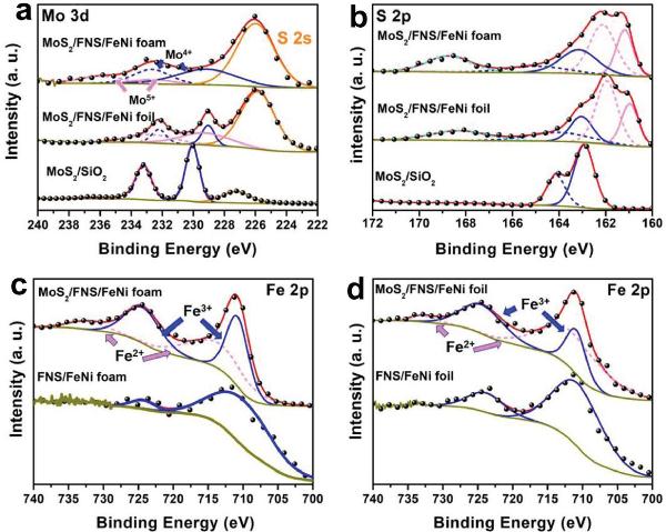 a) MoS2/FNS/FeNi材料的Mo 3d XPS光谱;