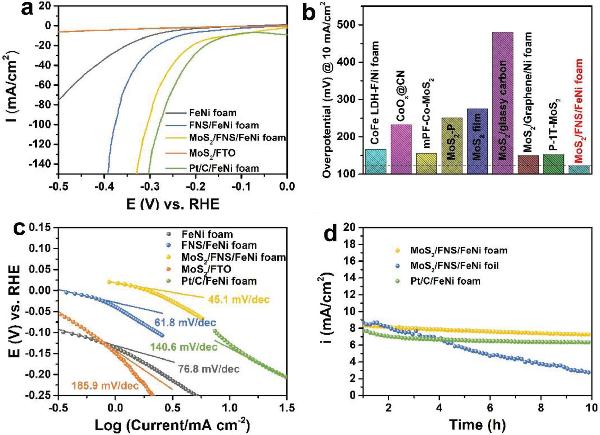 a) 1 M KOH中,MoS2/FNS/FeNi泡沫、FNS/FeNi泡沫、 FeNi泡沫和MoS2/FTO的极化曲线;