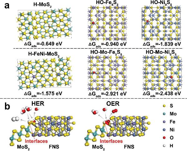 a) MoS2、Fe9S8、Ni9S8、MoS2/FNS(Fe, Ni-MoS2模型)、 MoS2/Fe9S8(Mo-Fe9S8模型)和MoS2/Ni9S8(Mo-Ni9S8模型)异质结的化学吸附模型以及相应的表面H和OH吸附能;