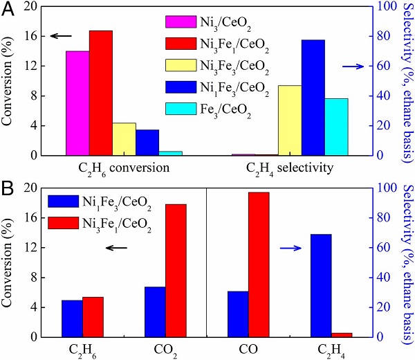 该工作结合实际情况,利用DFT计算的方法来确定了在CeO2基NiFe催化剂上的乙烷进行二氧化碳辅助脱氢的活性位点的两种类型。研究结果表明,Ni-FeOx与Ni-CeOx界面是乙烷(选择性C-H键裂解产生乙烯)和二氧化碳的干气重整(高效C-C键分离产生合成气)的最有可能的活性位点。对于CeO2基NiFe催化剂,主要是由于Ni-FeOx界面的形成取代了Ni-CeOx的界面,从而Fe在控制乙烯选择性方面发挥了作用。这些研究结果将有助于更好地理解活性位点与催化性能之间的关系,同时可以为CO2还原和乙烷脱氢的串联反应中的氧基金属催化剂提供调节和控制活性与选择性的策略。
