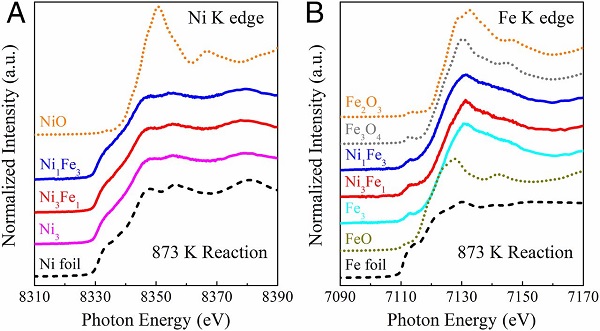 (B)在反应条件下,铁箔、FeO、Fe3O4和Fe2O3为参考的Ni1Fe3/CeO2和Ni3Fe1/CeO2中Fe的K边。