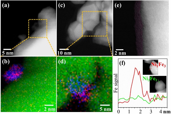 (B)在Ni1Fe3/CeO2中Ce(绿色)、Ni(蓝色)和Fe(红色)的混合图像。