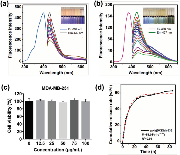 图4 Poly(CDM)-x(a)和poly(DCDM)-x(b)的荧光发射光谱。内部为紫外灯照射下poly(CDM)-x的氯仿溶液和poly(DCDM)-x的氯仿溶液;(c)CCK-8法细胞活力检测,待测工作液浓度为0-100 μg/mL;(d)poly(DCDM)-335的药物释放曲线。红线为拟合曲线。