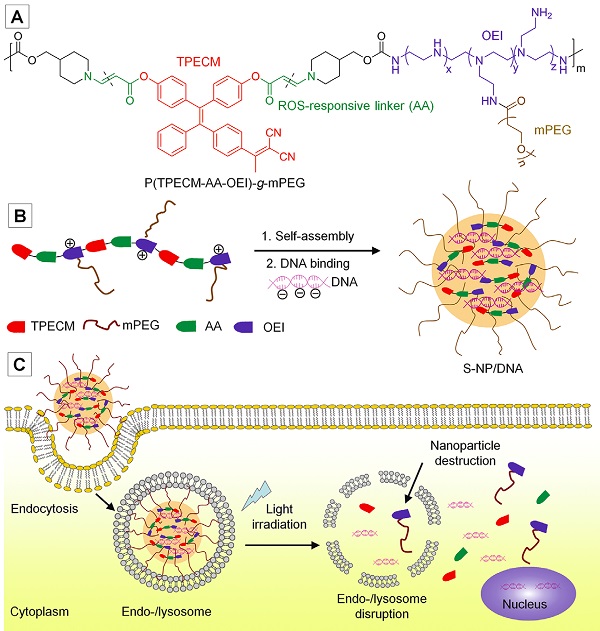 (b).P(TPECM-AA-OEI)-g-mPEG通过自组装形成纳米粒子,并通过静电作用负载DNA