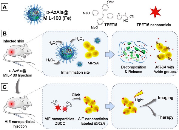 (b).D-AzAla@MIL-100(Fe)分解,在炎症部位释放D-AzAla,在细菌外壁上生成叠氮基团