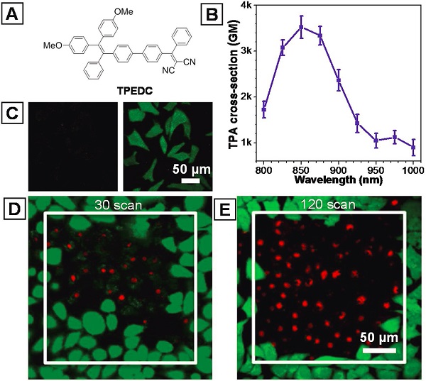 (d,e).细胞负载TPEDC纳米粒子在800nm激光扫描30次和120次后的活死细胞成像