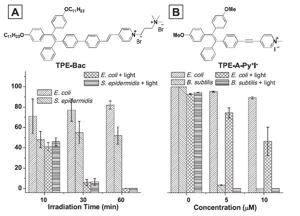 (b). TPE-A-Py+的化学结构,以及对大肠杆菌和枯草芽孢杆菌的光动力学治疗
