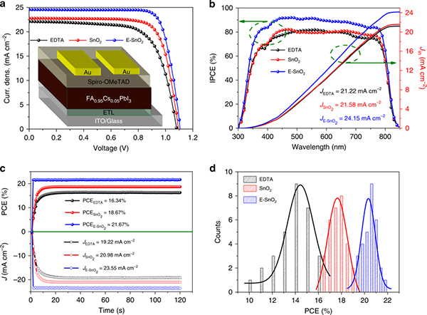 近日,陕西师范大学杨栋研究员、刘生忠教授和弗吉尼亚理工大学Shashank Priya教授(共同通讯作者)等人采用EDTA和SnO2的络合物(E-SnO2)作为平面钙钛矿电池的电子传输层,器件光电转换效率高达21.60%,美国Newport权威机构认证效率为21.52%,为目前已知平面钙钛矿电池效率之最。同时器件稳定性也有了极大改善。此外,因E-SnO2可低温制备的优势,将其应用于柔性钙钛矿电池中,器件效率最高为18.28%。研究表明由于钙钛矿层与电子传输层界面处电荷积累的消除,钙钛矿电池器件均无明显迟滞。相关成果以题为“High efficiency planar-type perovskite solar cells with negligible hysteresis using EDTA-complexed SnO2”发表在Nat. Commun. 上。