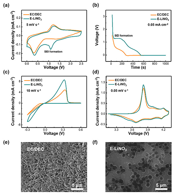 (e)纯EC/DEC和(f)含LiNO3的电解质中锂阳极的表面形态,电流密度为0.5mA cm-2,容量为0.1mAh cm-2。