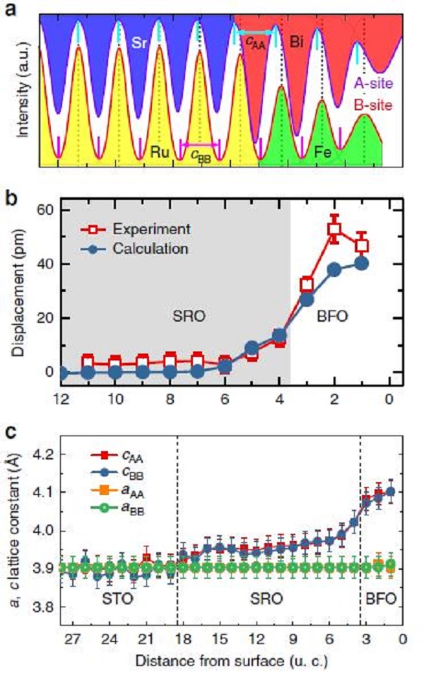 b在实验和计算中,SRO/BFO界面附近B位阳离子的平均偏心位移;