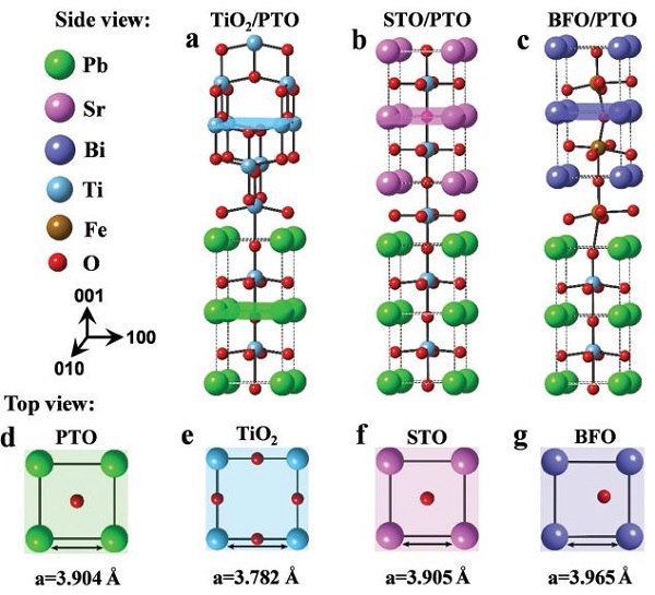 (d-g):异质结匹配模型中PTO、 Ti02、STO以及BFO外延生长晶面的俯视图。