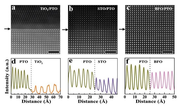 (a-c):分别为TiO2/PTO、STO/PTO和BFO/PTO纳米片正极化面处原子级分辨的HAADF-STEM图;