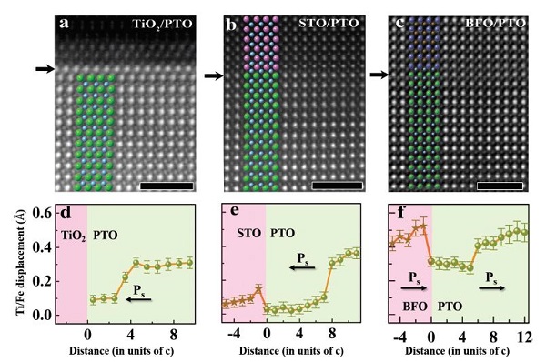 (a-c):TiO2/PTO,STO/PTO以及BFO/PTO异质结,每张图中的黑色箭头指向其异质结界面原子层;