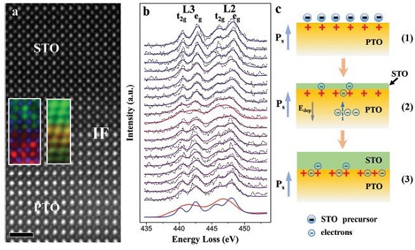 图4:STO/PTO界面电子能量损失谱及STO/PTO异质结生长模型