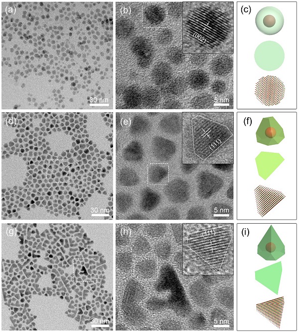 其中(b)(e)和(h)中的插图是对应的单量子点的HRTEM图像