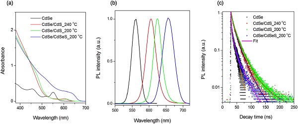(c)CdSe、CdSe/CdS和CdSe/CdSeS量子点的经典PL衰减曲线(点)和拟合曲线(实线),其中不同温度是在甲苯排放峰值处测量的,并以半对数尺度表示,激发波长设置为450 nm