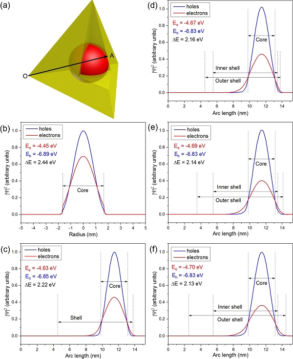 (b-f)分别是球形CdSe量子点沿着轴穿过核的中心(b)、锥形CdSe/CdS量子点(c)和不同厚度的锥形CdSe/CdSeS/CdS量子点(d-f)的1S电子和空穴波函数,其中将弧长定义为从锥形的一个角通过核的中心到对面的距离(即a中的O→A);CdSe核的半径为1.65 nm,(c)中的从核表面到A的CdS壳厚度为0.66 nm,(d-f)中CdSeS层的厚度为0.33 nm;在(d)、(e)和(f)中CdS壳厚度分别为0.33、0.66和1.00 nm,电子和空穴波函数的特征值分别为Ee和Eh,而ΔE = Ee-Eh,ΔE的总趋势与图2b一致