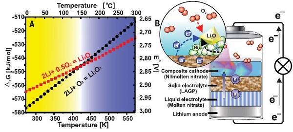 加拿大滑铁卢大学的L. F. Nazar(通讯作者)课题组报道了一种可通过高度可逆的四电子氧化还原反应产生氧化锂的新型锂-氧电池。研究人员首先将操作温度提高到150℃,在这一温度上热力学驱动力更倾向于形成氧化锂而非过氧化锂。而由镍纳米颗粒组成的非碳复合正极则能够原位形成锂镍氧化物(LixNiO2),可以作为促使氧氧键可逆断裂-形成的高效电催化剂。这使得电池在放电时可以产生高达11mAh/cm2的容量,而充电时氧气又可以在低过电势下进行反应。这一研究工作表明了锂-氧电化学可以突破现有电解质和超氧产物等产生的限制,实现接近100%的库伦效率。