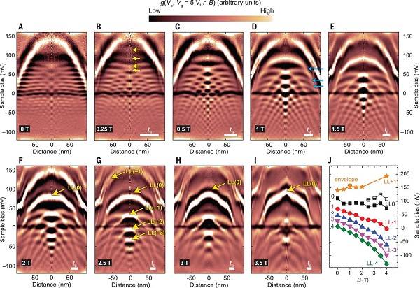 美国国家标准与技术研究院的J. A. Stroscio(通讯作者)等人利用隧道测量技术成功地将环形石墨烯谐振器中空间约束和磁约束之间的相互影响可视化,并直接观测到了电子相互作用的痕迹。石墨烯是一种表面暴露大量电子的二维材料,因此被认为是研究外加场中能级变化的理想材料。研究人员首先将石墨烯器件冷却到绝对零度左右,以便创造量子点-小岛作为人工原子,在强度为1特斯拉的磁场中,量子点中的电子堆积更加紧密,相互作用也被加强,最终这些电子将被以导电-绝缘同心环交替的形式进行重排。通过扫描隧道显微镜,不同电子能级的同心环图像被堆放在一起最终实现婚礼蛋糕型结构。因此这一研究为极端条件下观测和了解量子-相对物质的行为提供了有效的方法。
