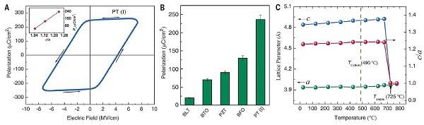 北京HTH官网地址 大学的陈骏教授以及邢献然教授(共同通讯作者)等人提出了新型“相间应变”的策略并以此在超四方性薄膜上实现了巨大极化。该研究发现利用晶格结构相似、晶格参数不同的两种材料,在外延生长时晶界处的晶格参数是相互匹配的,从而可在材料间产生各向同性应变,即“相间应变”。利用这种“相间应变”策略,研究人员在PbTiO3外延复合铁电薄膜上引入高负压从而实现了巨大的极化性能,其剩余极化强度可达到236.3微库伦/cm2,是现有已知铁电体的2倍。此外,这种薄膜的超四方性相在725℃的高温下依然稳定,而对应块体的相转变温度却只有490℃。