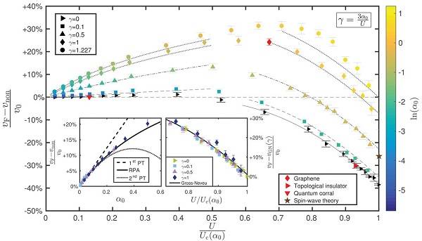 新加坡国立大学的S. Adam教授(通讯作者)团队采用非微扰、精确数值的投射量子蒙特卡洛方法以可控的方式研究可观测物理量的演化,研究发现,在由长程相互作用所控制的区域,费米速度的增强与微扰理论一致。相反地,在靠近由短程相互作用所控制的相变区域,研究人员发现费米速度会被抑制并且数值数据也会崩溃,而对于一条曲线上的长程和短程相互作用的比例也会产生不同的值。此外,研究人员通过重整化群方案将量子蒙特卡洛结论外推到与实验相关的能量标度,所预测的可观测量将取决于库仑相互作用的短程和长程分量以及所观测的能量标度(所有参数都可以在当前的实验中进行调整)。