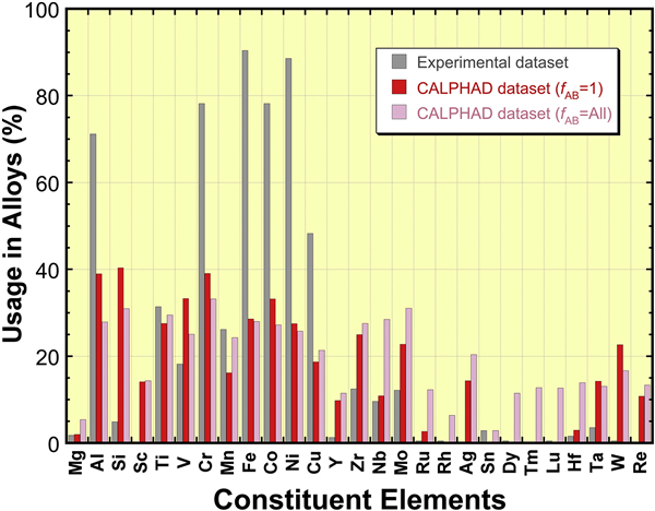 图7 在实验和两个CALPHAD中元素的使用频率图。