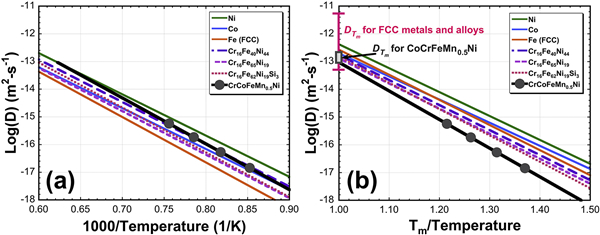 图9 在FCC不锈钢合金和CoCrFeMn0.5Ni合金中,Ni(DNi)的扩散系数:(a)反向温度函数的扩散系数,(b)反向通过主体合金熔点的扩散系数归一化图。