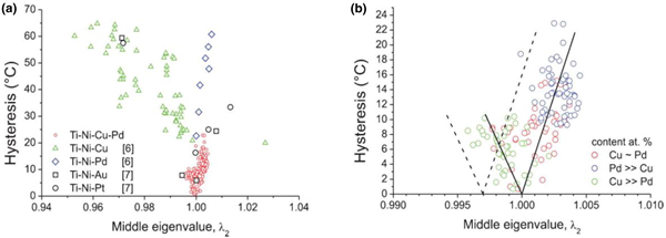 (a)Ti-Ni-X-Y合金的滞后与λ2曲线图;