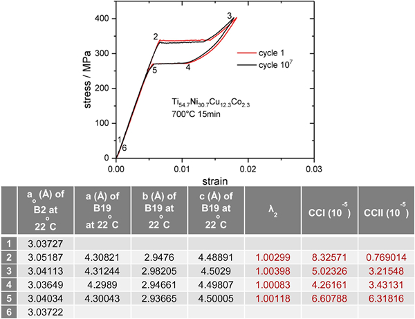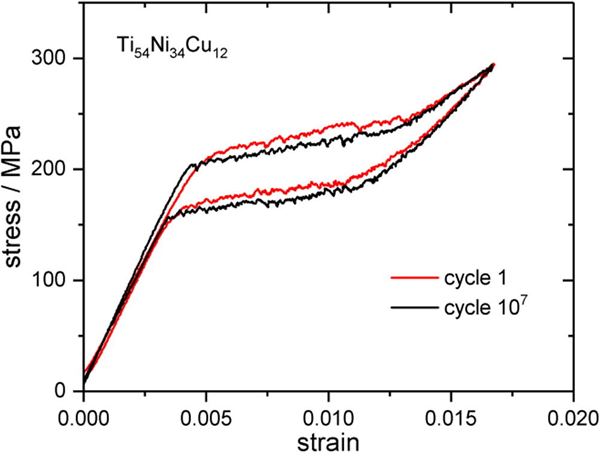 图 8 富Ti的TiNiCu合金的第1、200和107次的超低疲劳曲线图