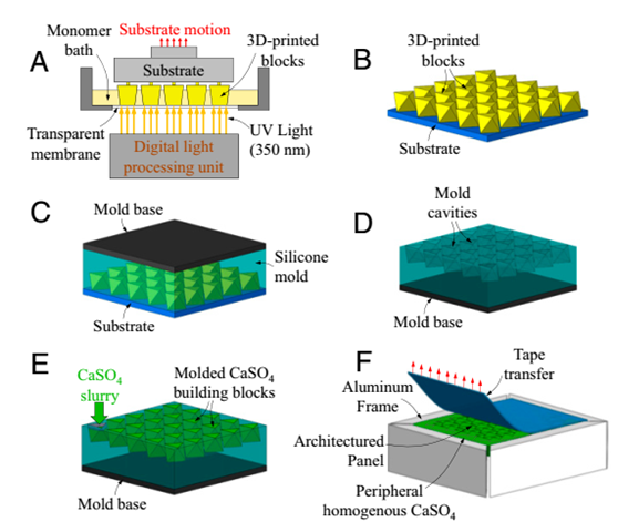 图2.本研究探索的15个建筑面板设计概述:对于每个组,显示了单个块的几何形状,以及由CaSO4块制成的7×7面板的组件示意图和图片。