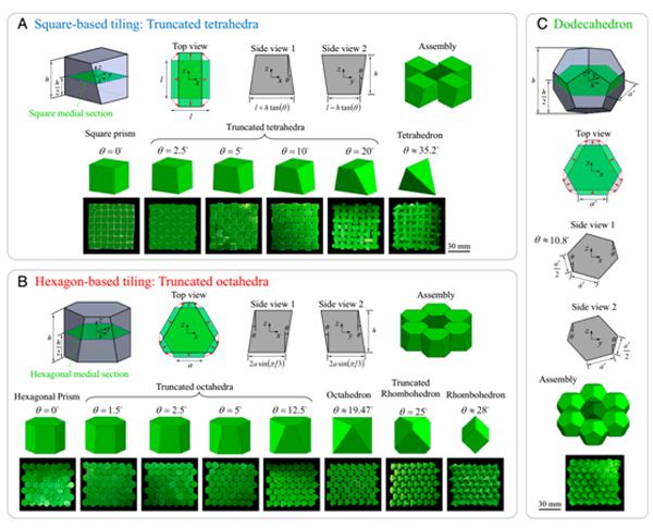 构筑特定的微观结构,利用材料异质性或混合成分已经被大量证明可以提高现代材料的性能。拓扑互锁材料(TIM)使用摩擦滑动产生大的变形并在其他所有脆性部件中建立韧性。TIM的抗冲击性比单片形式高10倍,但这种改进通常以静态强度为代价。本文报告基于八面体块的TIM设计,其不仅比相同材料的整体板更坚韧(50×),而且更强(1.2×)。由于TIM材料没有强度和韧性上限,具有作为高性能结构材料的巨大潜力。基于本研究工作,本文提出了一个无量纲的“互锁参数”,可以指导未来的研究。在这项工作中,研究者们系统地探索了基于柏拉图形状的建筑面板的设计以及它们的截断版本,以深入了解这些系统的结构-力学-性能关系。