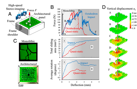 (B)在准静态和冲击条件下测试由八面体块制成的建筑板的力-挠度曲线。具有相同面密度的整体板的响应也显示用于比较。另外两个图显示了在立体成像和3D重建获得的测试过程中块的总滑动面积和平均旋转;