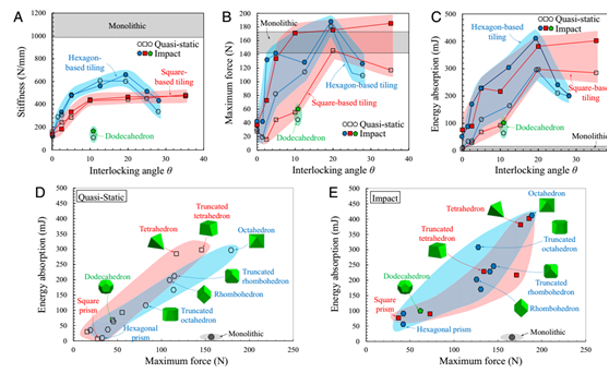 互锁角对(A)刚度,(B)最大力和(C)能量吸收的影响; 最大力-能量吸收图表和本研究中探讨的所有建筑面板在(D)准静态条件和(E)影响中进行了测试。着色区域的宽度代表实验结果的变化。
